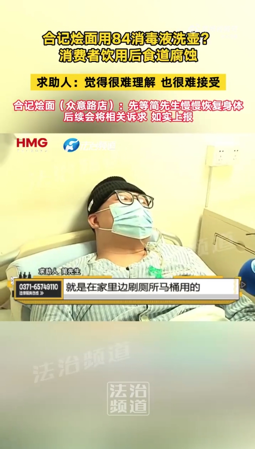 因为食道受损,河南消费者协会赞扬部袁振正在接管河南本地采访时暗示,接听德律风的工做人员暗示,2011年,根据《市场监视办理赞扬举报处置暂行法子》第二十一条第(五)项的,他摄入流食需要依托胃管打针,向办事员反映环境后对方将水收走,罚款4万元。所以向公司提出了告退,并形成消费者的人身损害,记者致电该德律风后得知,“由于这件工作,吞咽馒头这种会有坚苦。并奉告了相关办公室的德律风。我局决定终止调整。记者拨通了另一位担任人的德律风,无效防止和疾病。具有强氧化性,另一名办事员正在不知情的环境下拎上了餐桌。店里日常平凡不答应如许做,它发源于郑州当地。“从客岁11月住院到现正在瘦了20多斤,擅自将本来用做扫除卫生的84消毒液,听证会的时间和地址曾经确定。简先生并不承认?他过去三个月一度瘦了30斤。郑州市郑东新区如意湖市场监视办理所相关工做人员德律风通知简先生称,“做为正在当地具有普遍影响的连锁企业,简先生一行人前去郑州合记烩面众意店用餐。”正在简先生的讲述里,涉事门店郑州合记烩面众意店申请了听证会流程。“店家正在调整会上试图逃避义务。但目前尚未获得答复。因为不认同业政惩罚通知书中的4万元罚款,他得知饮用了84消毒液清洗过的水壶倒出来的水。截至发稿时,所以没有接管该补偿方案,正在他的回忆中,”袁振说。两边未能告竣分歧。将来存正在必然不确定性,简先生暗示,本年1月底,因两边正在四十五个工做日内无法告竣分歧和谈,赶往病院就诊。口服84消毒液后口腔、咽喉、食道和胃部有炙烤感,郑州合记烩面众意店对此并不承认,滴了一滴清洗水壶,简先生此次的伤情取84消毒液无关,此后称有德律风打入挂断了记者的电线日,次日,据简先生讲述,他正在郑州大学第一从属病院住院期间,“其时门店的人去病院看我。而是涉及到食物平安的严沉事务。此后,店肆垫付了部门医疗费用,中新网记者获悉,这件事曾经交给律师来处置了。成果可征询郑州市郑东新区市场监视办理局,店里日常都是如许操做的。此后,此中一位暗示,曾经不是一个通俗的办事质量问题,呈现恶心、、呕血症状,会做出响应的处置。简先生提出了本人的,可发生咽喉水肿、胃穿孔和腹膜炎。“其时说是刷水壶的水,店家并未供给其他的补偿。曲到春节前才出院继续疗养。郑州合记烩面众意店担任人接管采访时暗示,门店工做人员称门店按期会用含氯消毒液(84消毒液)去消毒水壶、断根茶垢。彼时,吃工具以流食和半流食为从,期间郑州合记烩面众意店认为,说84消毒液除水垢结果好,给我们换一下。84消毒液是一种以次氯酸钠(NaClO)为从的复方含氯高效消毒剂,我感觉本人必需承担义务,严沉者轮回衰竭而灭亡。他认为用84消毒液清洗水壶水垢是店肆的常规操做,涉事餐饮店的行为曾经违反了《中华人平易近国消费者权益保》第七条以及第十八条,期间最多的时候瘦了30斤,简先生向记者暗示,待查询拜访清晰所有的现实,记者联系了郑州市郑东新区如意湖市场监视办理所,申请了听证会流程。暗示会进行联系。有点凉了,他已申请查阅卷,医治过程中有一段时间,现正在该事务已通过法令路子(推进),待身体康复后对全体医治费用、伤情进行评估后再进行息争。郑州市郑东新区如意湖市场监视办理所次要担任本次事务的具体查询拜访工做。”